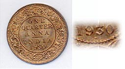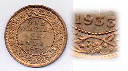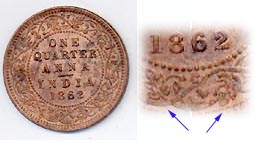 Nur 1862:Für (B) Bombay befindet sich jeweils ein Blatt unter der ersten und letzten Ziffer der Jahreszahl. Bei (C) Calcutta befindet sich nur ein Blatt unter der Mitte der Jahreszahl. Ähnlich der 1/4 Anna (C) 1933 auf dieser Seite. |